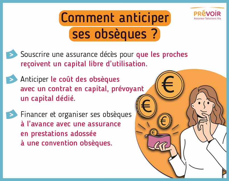 - Une assurance obsèques en prestations, a pour unique objectif de financer et d’organiser les obsèques. En plus de prévoir un capital dédié au financement des obsèques, le contrat est adossé à une convention obsèques, dans laquelle l’assurée peut indiquer toutes ses dernières volontés. Crémation, enterrement, cérémonie religieuse ou civile… Tout peut être déterminé à l’avance. Ce genre de contrat permet de soulager vos proches, à la fois sur le plan financier et le plan décisionnel.
